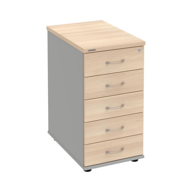 Kontajnery - všetko uložené a vždy poruke. Kontajnery sa väčšinou umiestňujú pod stoly. Mobilné modely sú vybavené kolieskami, je možné ich premiestniť podľa potreby. Základným materiálom korpusov je kvalitná laminovaná drevotriesková doska hrúbky 18 mm. Pre dlhšiu životnosť je na horný diel korpusu použitá doska, ktorej hrúbka je 25 mm. Korpusy a čelá zásuviek sú chránené proti poškodeniu hranou ABS 2 mm. Kontajnery sú vybavené zámkom s centrálnym zamykaním. Vďaka integrovanému systému STOP-CONTROL s centrálnym zámkom u väčšiny kontajnerov sa nemusíte báť prevrhnutiu kontajnera alebo prípadného privretia ruky. Systém zaručí, že pri otvorení jednej zásuvky sa ostatné zásuvky automaticky zablokujú. Zásuvky sú z plastu, ktorý je ľahko umývateľný a vhodný pre jednoduchú údržbu. Praktickou súčasťou vrchnej zásuvky je prehľadný organizér a priestorové deliace priečky. Vaše ceruzky, sponky a ďalšie kancelárske potreby budú vždy na poriadku. Organizér a deliace priečky sú súčasťou každého kontajnera. Na kontajnery Hobis sa vzťahuje päťročná záruka.
