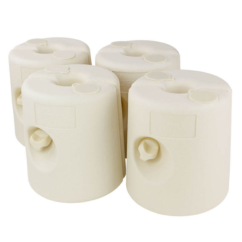 : DEMAZávažia môžu byť jednoducho upevnené alebo uvoľnené skrutkovým spojom. Pre zaťaženie nôh, tyčí pavilónu, plachiet na karavane alebo obytnom automobile. Z plastu nenáročného na údržbu a odolného voči poveternostným vplyvom. Možnosť plnenia vodou alebo pieskom.