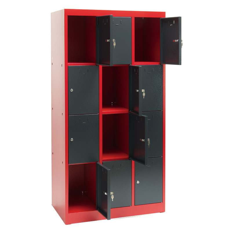 Kovová skriňa s oceľovou konštrukciou s povrchovou úpravou práškovaním v červenej a antracitovej farbe. S 12-timi uzatvárateľnými priečinkami je v nej dostatok miesta pre každého. Každý uzatvárací priečinok má svoj vlastný, očíslovaný kľúč a menovku. Kovová skriňa s oceľovou konštrukciou s povrchovou úpravou práškovaním v červenej a antracitovej farbe. S 12-timi uzatvárateľnými priečinkami je v nej dostatok miesta pre každého. Každý uzatvárací priečinok má svoj vlastný, očíslovaný kľúč a menovku. Nitované poličky zabraňujú vniknutiu a dokonale zabezpečujú každú jednotlivú priehradku.