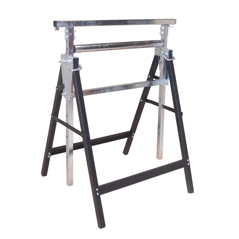 : DEMASkladací podstavec pre bezpečnú prácu vďaka pripojiteľným krížovým výstuhám. Viacúrovňové nastavenie výšky, sklopný bočný doraz na zabránenie pádu obrobku. Kovový valec s dĺžkou 52 cm (na hobľovacie práce). Dodáva sa v demonte.