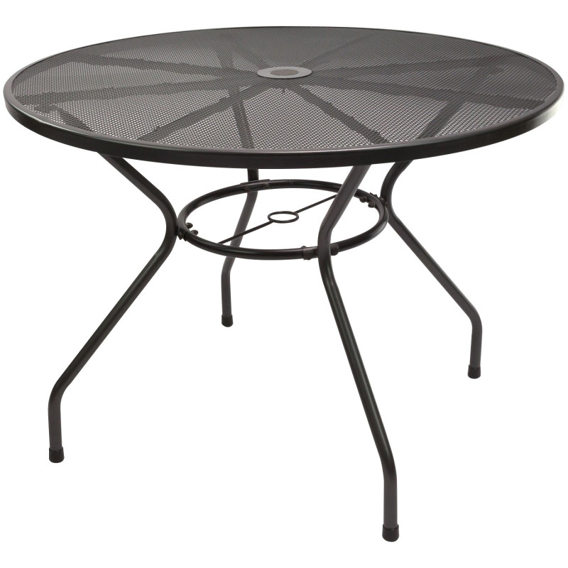 : DEMAPevný stôl s otvorom na slnečník, lakovaný kovový korpus, umývateľný, krytky na nohách, dodáva sa nezmontovaný.