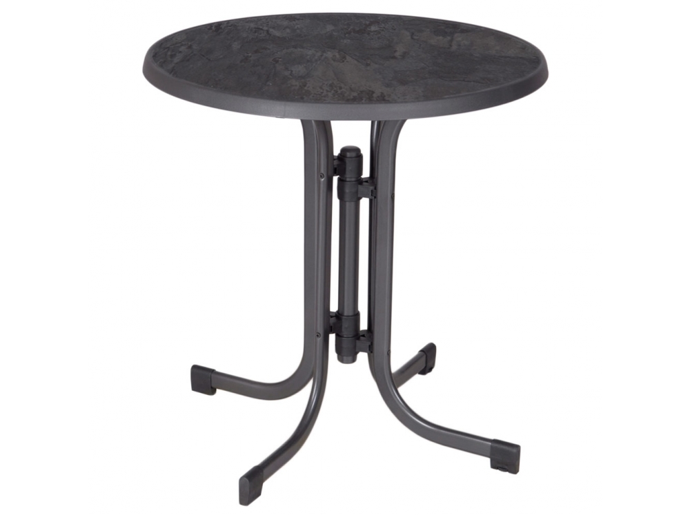 Okrúhly skladací stôl s kovovou, pevnou konštrukciou a odolnou vrchnou doskou. Vhodný na vnútorné aj vonkajšie použitie - do záhrad, na terasy, do reštaurácií alebo kaviarní. Odolný voči UV žiareniu, poveternostným vplyvom a mechanickému poškodeniu. Jednoduchá údržba, umývateľný, skladovateľný.
