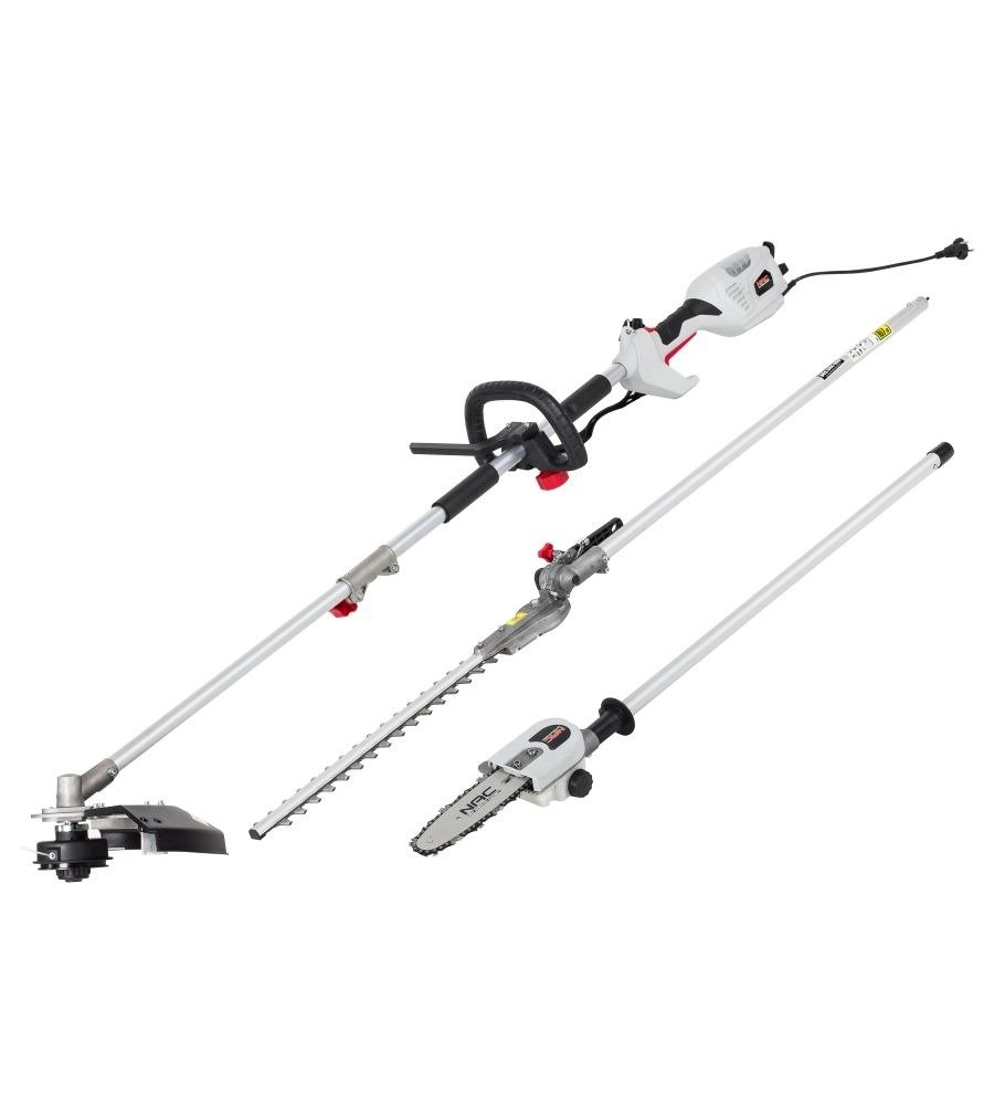 : NacMultifunkční elektrický křovinořez 3v1, příkon 900 W. Nástavec pro křovinořez, řetězovou pilu a plotostřih. Pohodlná rukojeť, popruh pro pohodlné přenášení. Dosah až 180 cm. Nastavitelný úhel u nůžek na živý plot. Skladná hnací hřídel.