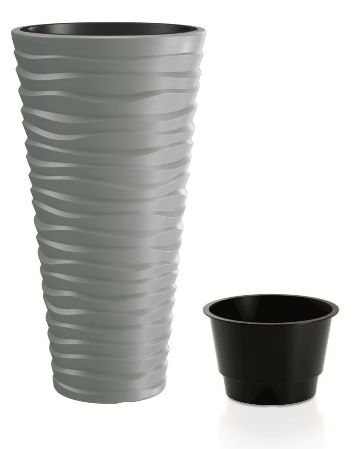: ProsperplastVysoký kvetináč, objem 37 l, dizajn s textúrou vlniek, vhodný do exteriéru aj interiéru, v balení praktická vložka na sadenie rastlín, rozmery 34,9 x 61,9 x 34,9 cm, šedá farba.