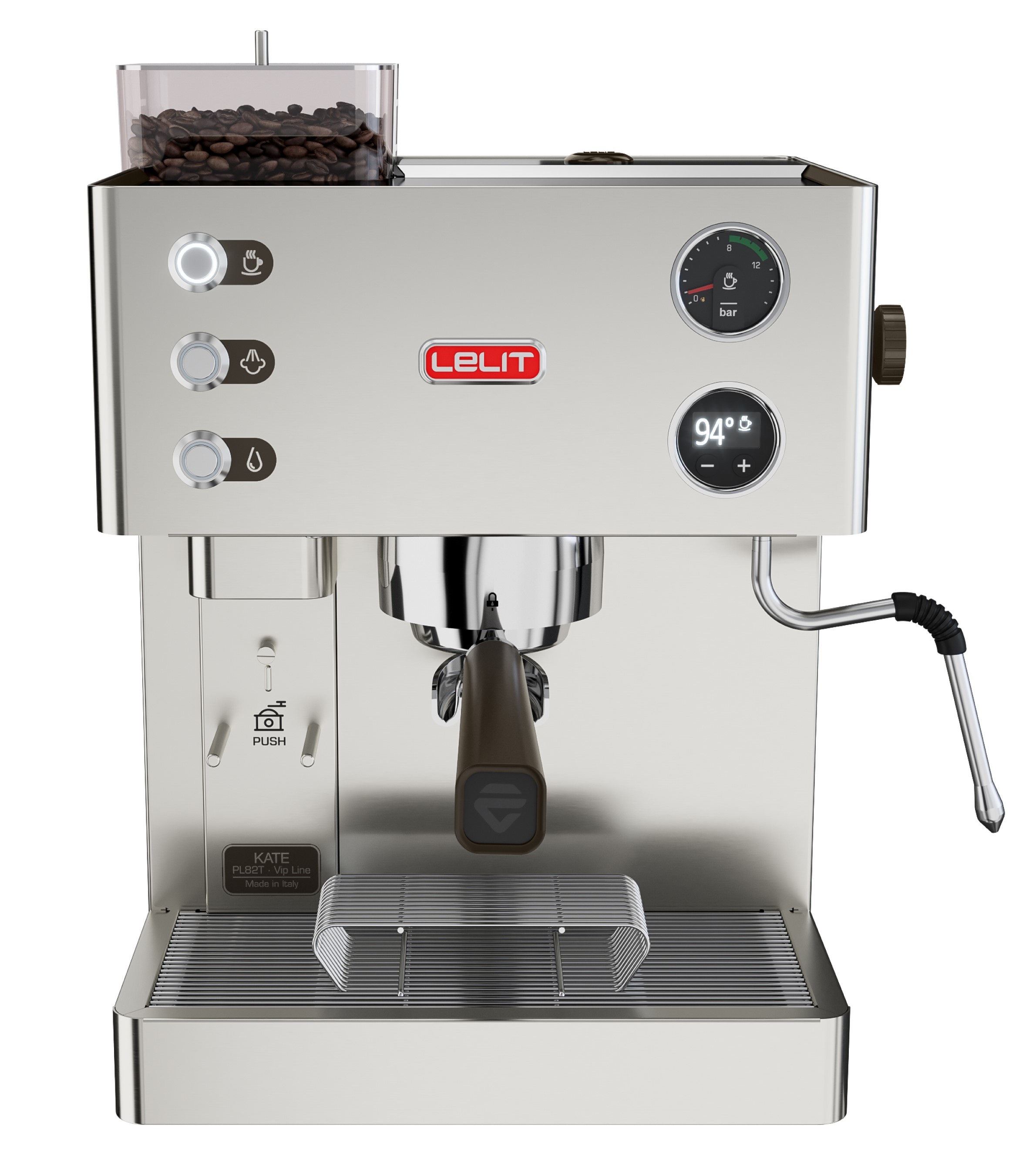 Lelit Kate PL82T je pákový kávovar vybavený mikrometricky přesným mlýnkem, mosazným bojlerem a chromovanou tryskou pro výdej horké vody či páry. Schránka kávovaru je celonerezová.