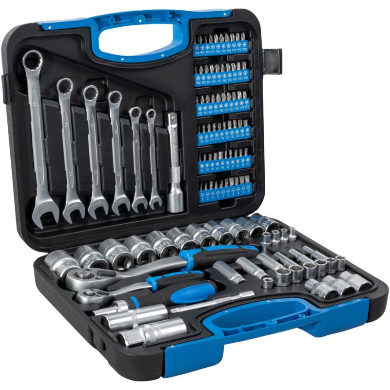 : GüdeSada náradia z chróm-vanádiovej ocele v praktickom plastovom kufríku zahŕňa 2 račne (1/2" a 1/4" so 72 zubami) s predĺženiami a nástrčkovými kľúčmi, široký sortiment bitov, bitový skrutkovač s račňovou funkciou a potrebné adaptéry, očko-vidlicové kľúče.