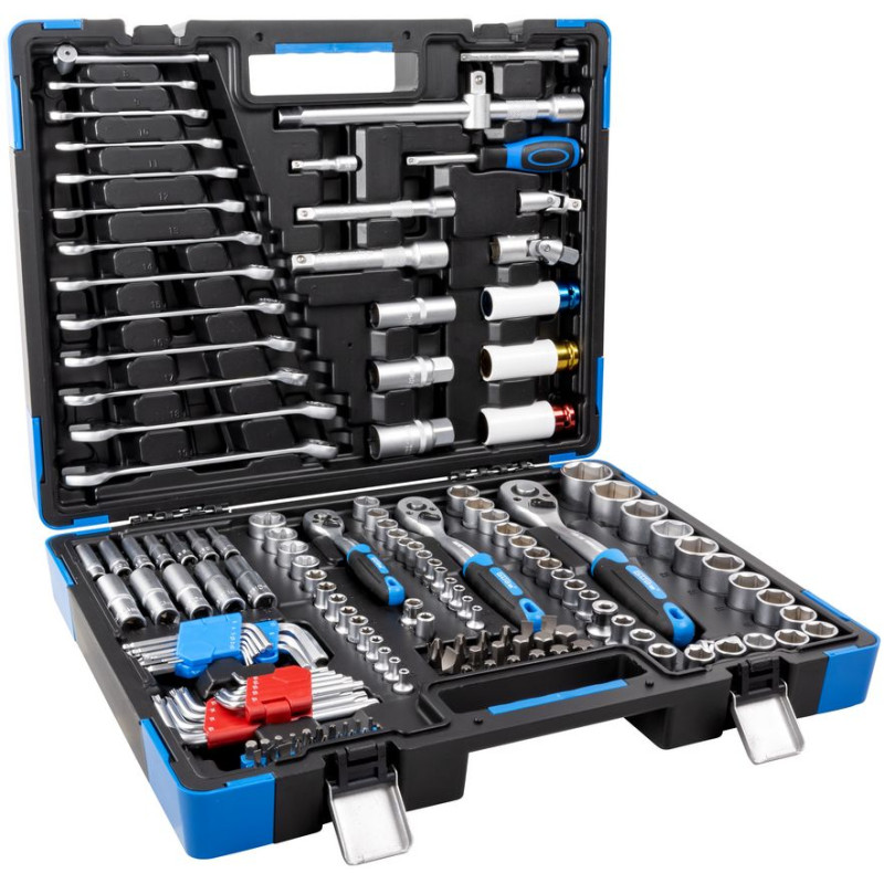 : GüdeSada náradia z chróm-vanádiovej ocele obsahuje 3 račne na prepínanie (1/2", 3/8", 1/4"), predĺženia, kardanové kĺby, očko-vidlicové kľúče, inbusové kľúče, nástrčkové kľúče, posuvné T-rukoväte, bitové adaptéry, skrutkovač s račňovou funkciou, súpravy bitov, nástrčkové kľúče na rázový uťahovák.