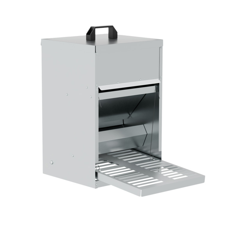 Kŕmidlo je vybavené dvierkami, ktoré sa automaticky otvoria, akonáhle sliepka na krmítko šliapne. Tým je krmivo dostupné iba vašim sliepkam a zostáva chránené pred vonkajšími vplyvmi.
