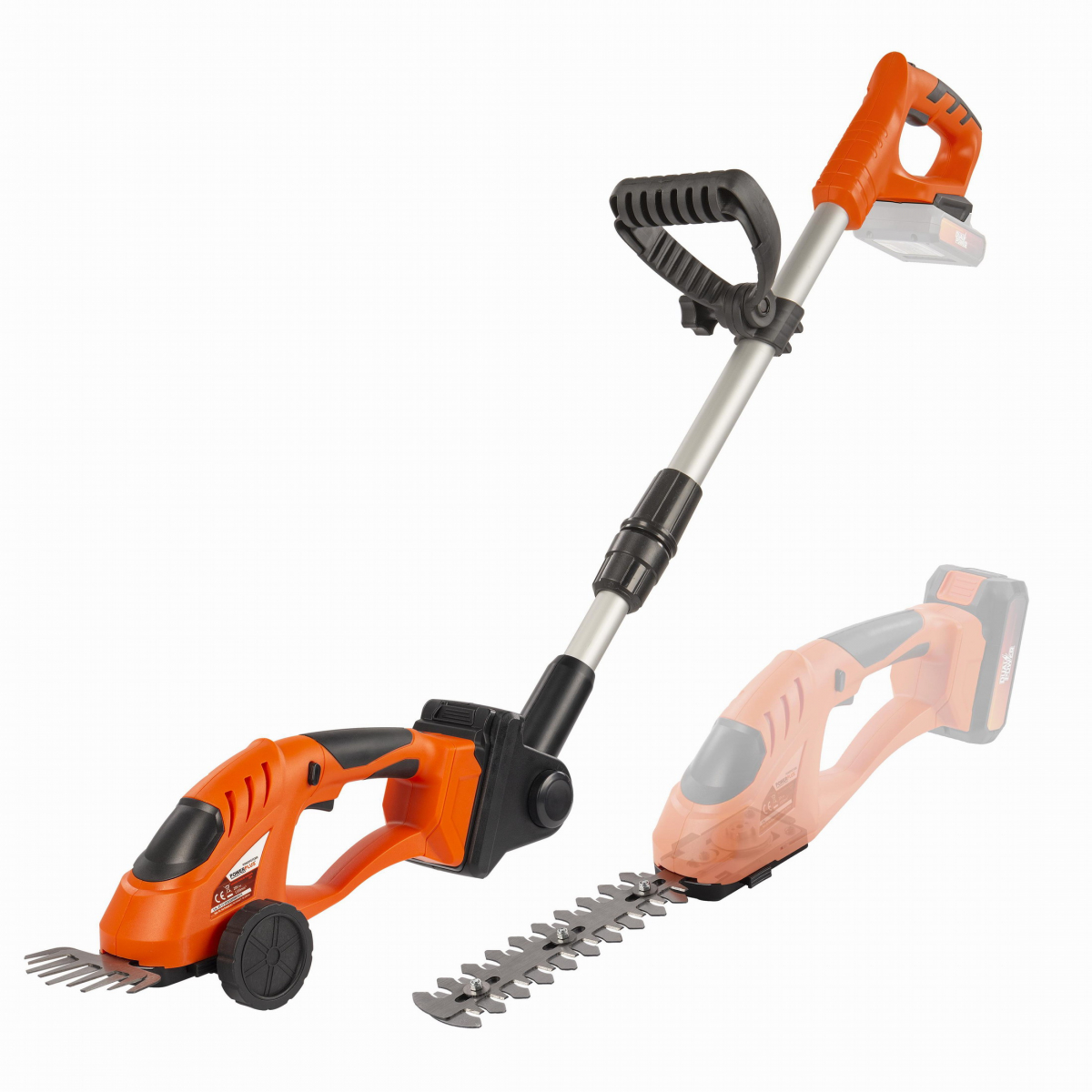 2 v 1 – nožnice na trávu a plotostrih, napätie 20 V, šírka lišty na trávu 100 mm, dĺžka lišty plotostrihu 185 mm, dĺžka teleskopickej tyče 630 až 920 mm, program Dual Power, praktické kolieska.