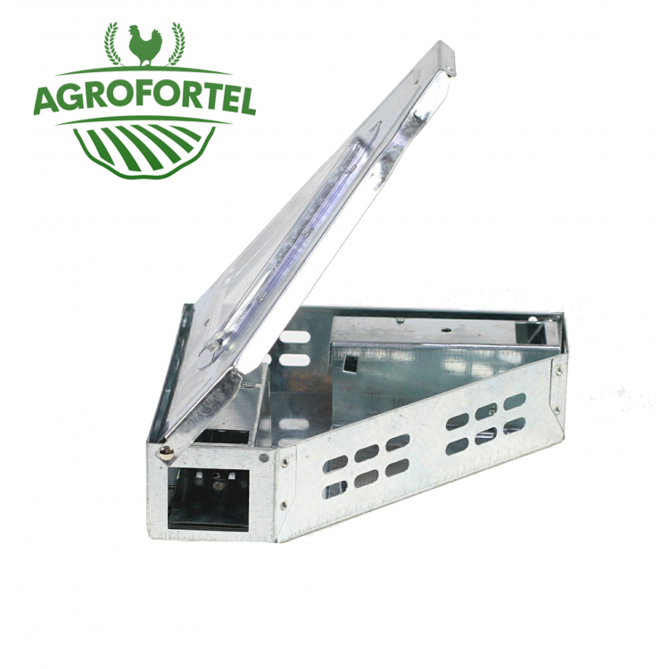 : AgrofortelPasca na myši - Domčekové obdĺžniková s priehľadným krytom, 2 vstupy, s preklápacou lávkou. Myš vlezie dnu, za ňou sa zatvoria plechová padacie dvierka.