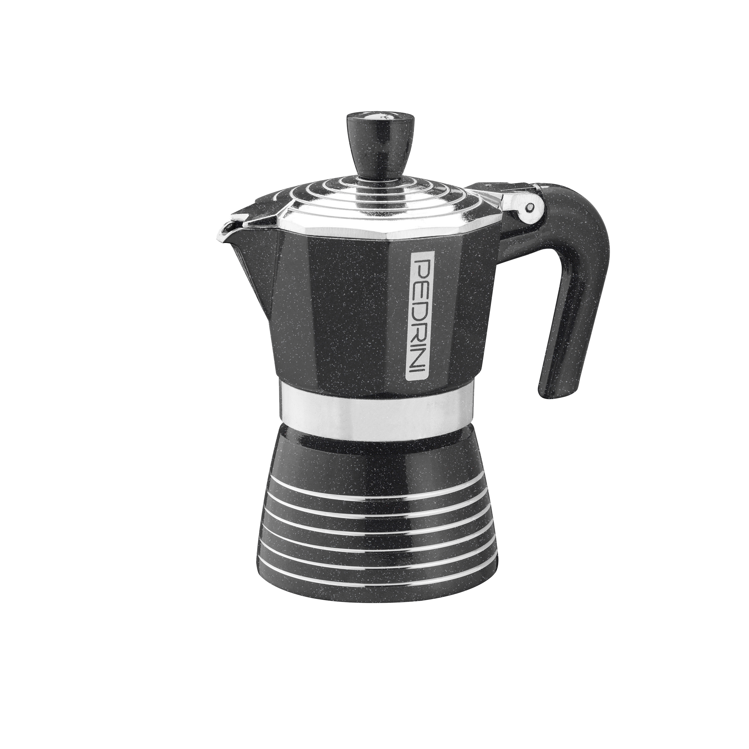 : PedriniDesignová moka konvička z potravinářského hliníku. Rukojeť konvičky je zhotovena ze speciálního termoplastu o přibližné tepelné odolnosti 210 °C. Konvička je natřena žáruvzdornou třpytivou glazurou a zdobí ji kruhové obrazce.