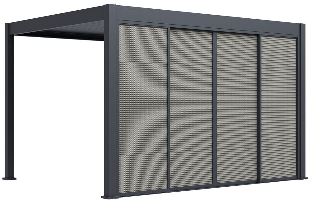 : RojaplastPre maximálne využitie bioklimatických pergol ponúkame aj príslušenstvo v podobe posuvnej zásteny s hliníkovou konštrukciou a textilnou výplňou, ktorá poskytuje ochranu pred vetrom a zároveň vytvára príjemný tieň. Posuvná zástena sa skladá zo 4 posuvných panelov v 2 koľajniciach.