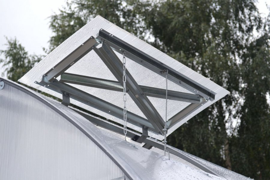 : Volya LLCPrídavné vetracie okno pre polykarbnátový skleník Strelka. Jednoduchá montáž automatického otvítŕača.