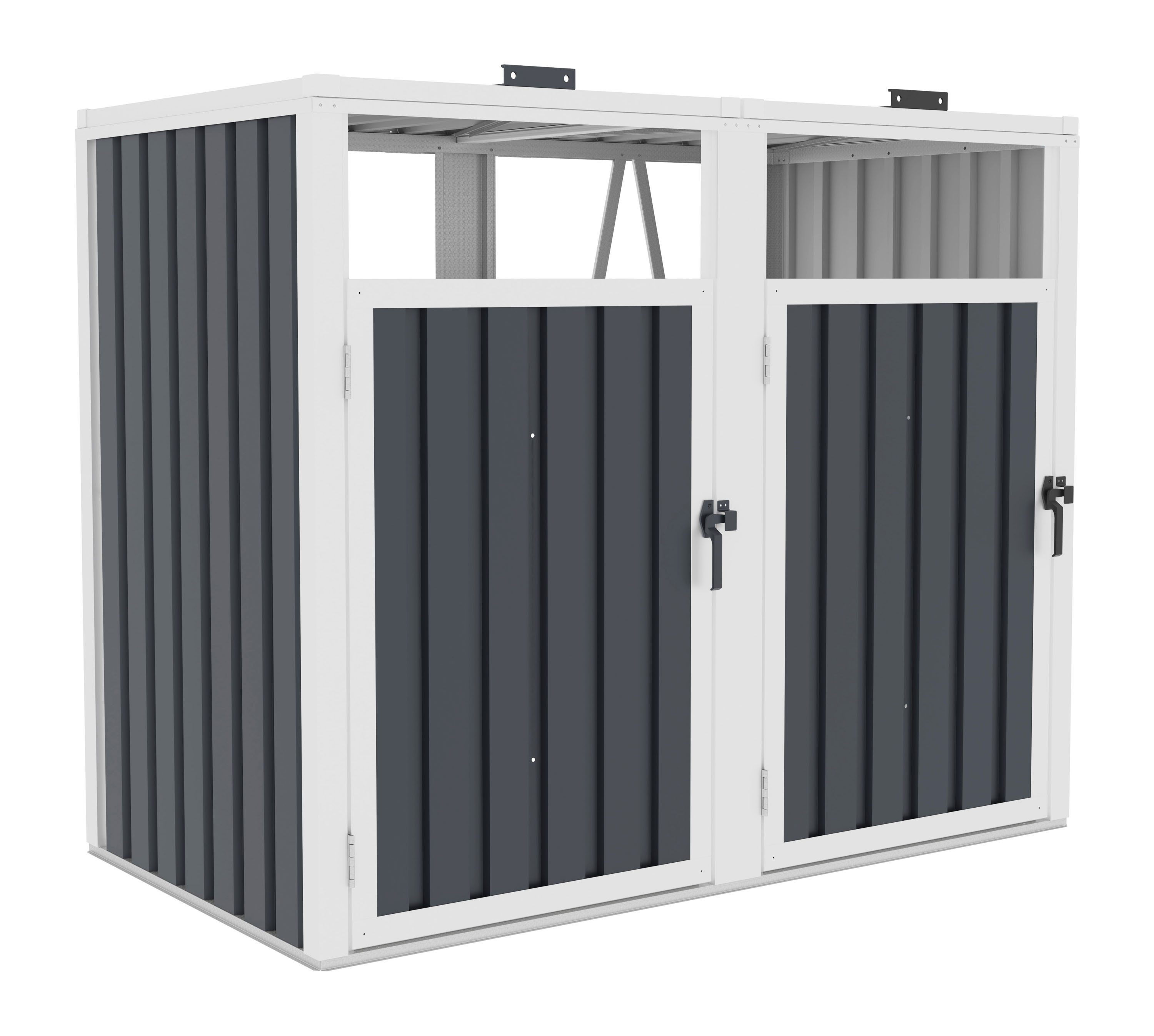 136.99 Štýlový prístrešok z pozinkovanej ocele – pre 2 popolnice s objemom až 240 l, odolný voči poveternostným vplyvom, jednoduchá montáž, moderný antracitový dizajn, praktické otváranie zhora aj z čela, poistka proti samovoľnému otvoreniu.