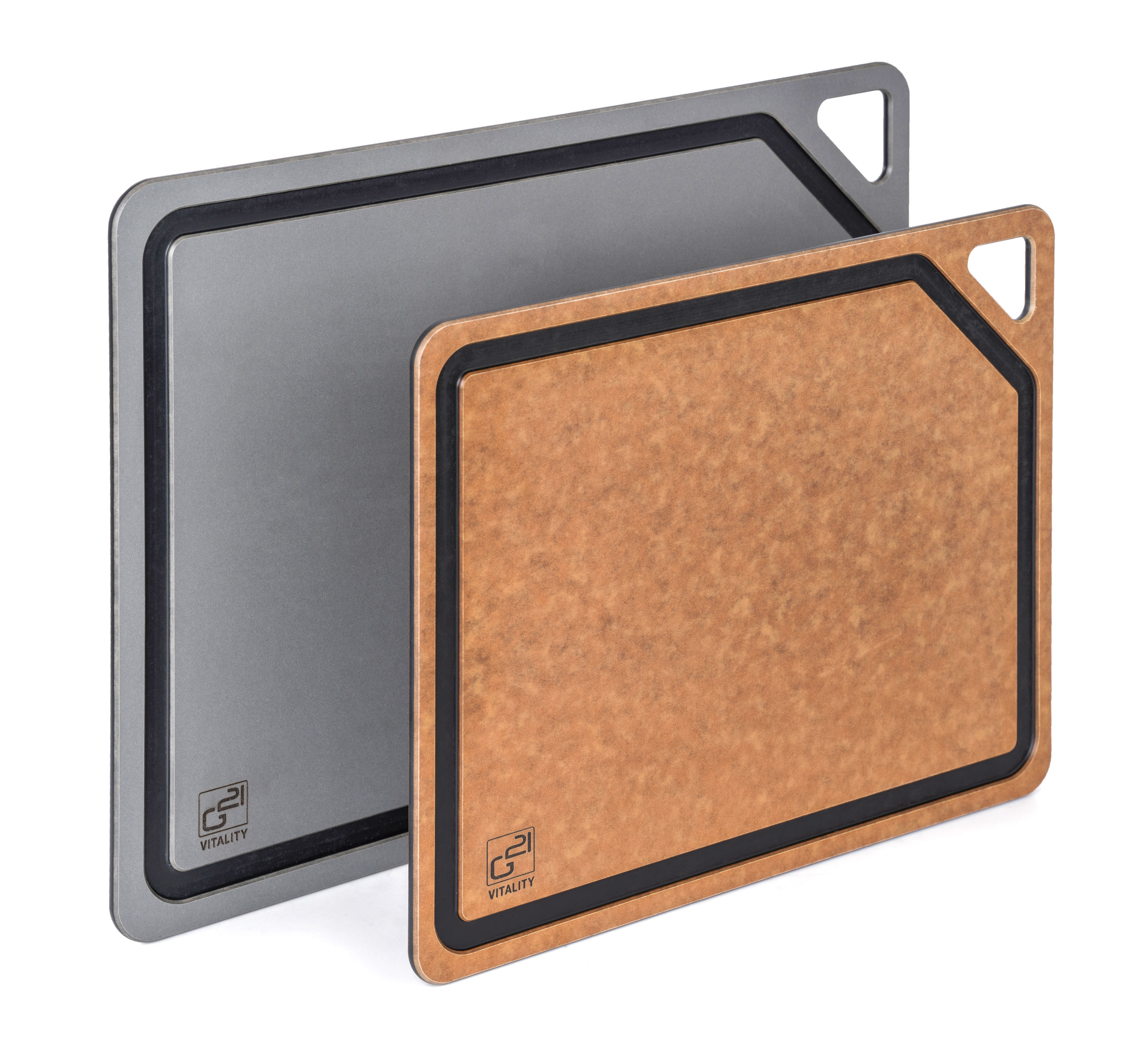 Krájacie dosky G21 EcoCut z prírodnej celulózy, sada 2 ks (30 × 23,5 cm a 37 × 27,4 cm), s protišmykovou úpravou. Hygienické, neporézne a odolné dosky sú šetrné k nožom a vhodné aj do umývačky riadu.