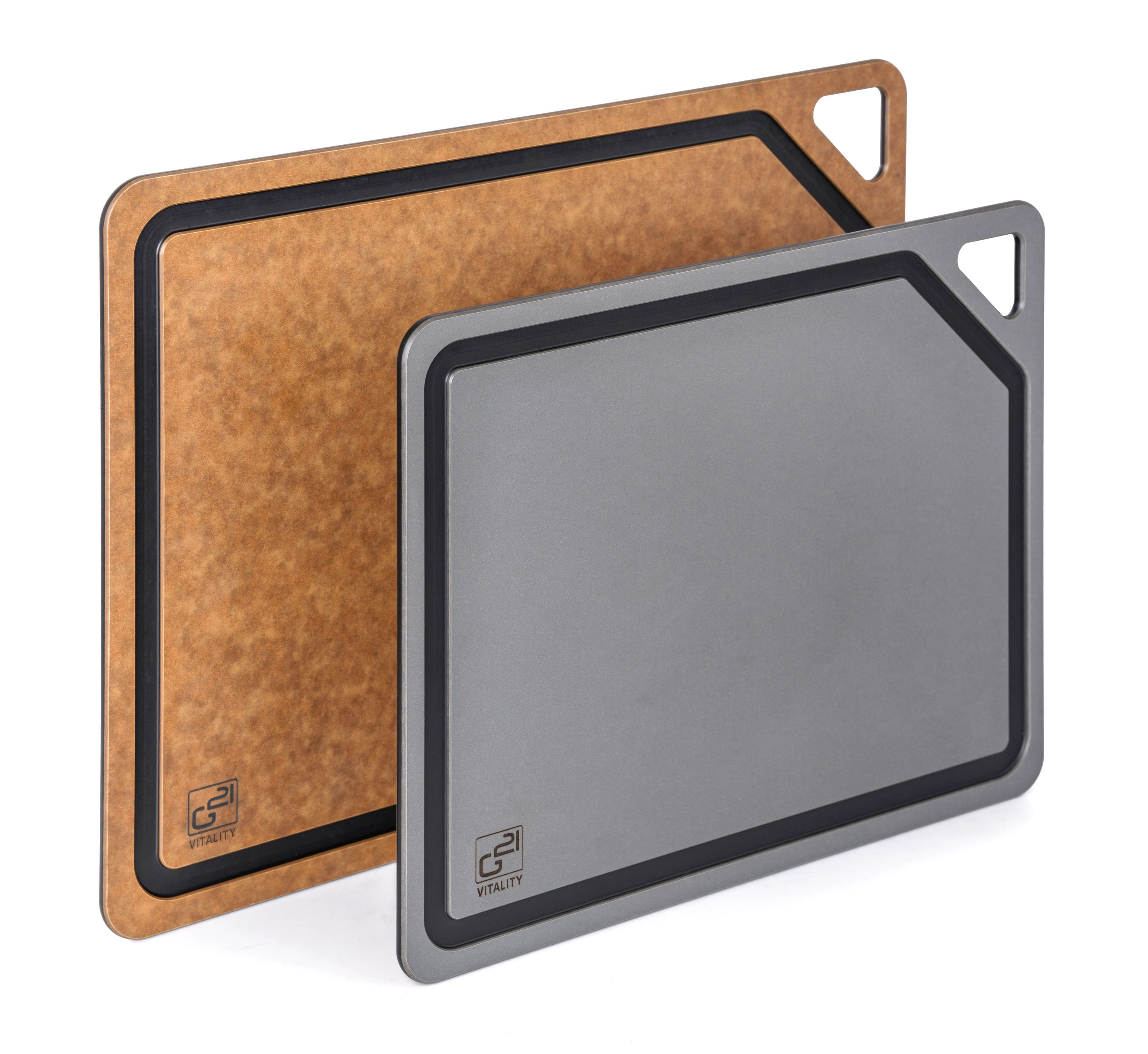 Krájacie dosky G21 EcoCut z prírodnej celulózy, sada 2 ks (30 × 23,5 cm a 37 × 27,4 cm), s protišmykovou úpravou. Hygienické, neporézne a odolné dosky sú šetrné k nožom a vhodné aj do umývačky riadu.