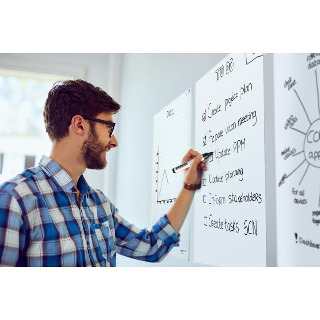 Rolka fólie s 15 štvorčekovanými listami (rozmer štvorčeka 2,5 × 2,5 cm) z bieleho polypropylénu v šírke 90 cm. Perforácia po 120 cm. Popisovanie permanentnými popisovačmi (edding). Elektrostatický náboj umožní priľnutie filmu na rôzne povrchy - sklo, stenu, drevo a tapetu bez použitia lepidla. Fóliu jednoducho odmotáte, v perforovanom mieste odtrhnete a zľahka pritlačíte na daný povrch. Na obale hárku je perforácia na uchytenie balenia na flipchartovú tabuľu. Povrch fólie umožní tiež udržanie papierových poznámok bez ich nalepenia. Väčšie balenie 4 blokov.