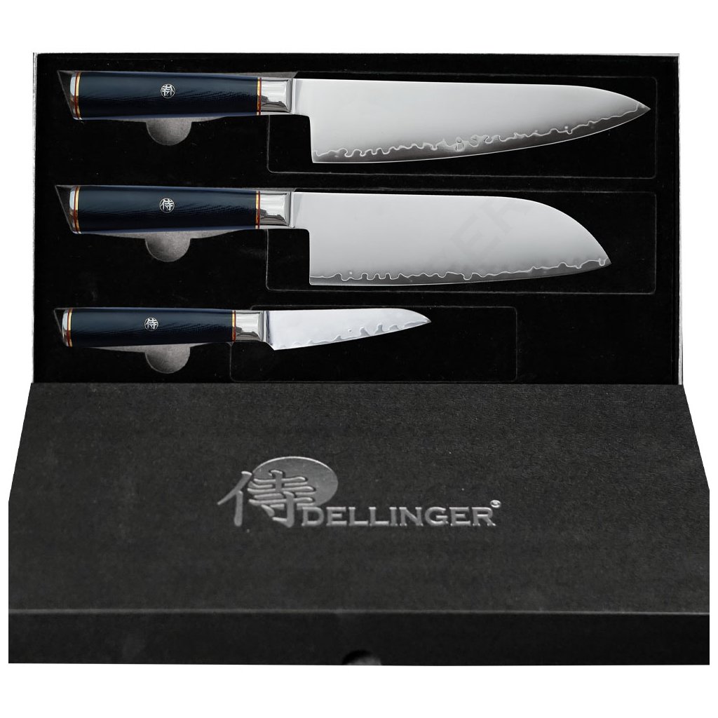 : DellingerSúprava kuchárskych nožov, japonská oceľ AUS-10 (HRC 58–62) pre maximálnu ostrosť a výdrž, 3-vrstvová konštrukcia čepele. Rukoväť z materiálu G-10 s mozaikovým nitom, vyvážená konštrukcia. Uhol brúsenia 15° zachováva tvar aj štruktúru potravín.