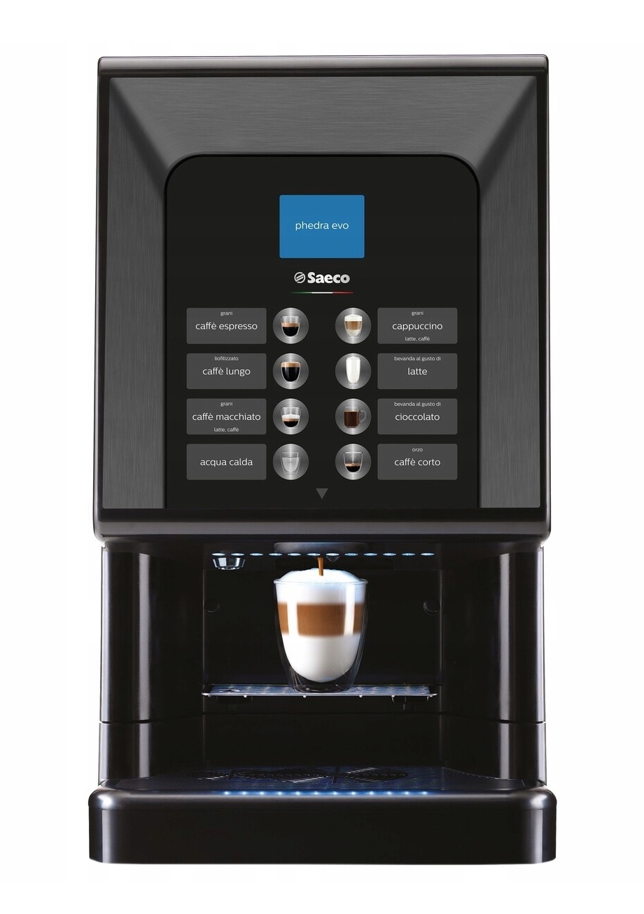 Saeco Phedra EVO Cappuccino je spoľahlivý automatický kávovar disponujúci rýchloohrevným mosadzným bojlerom, nerezovým mlynčekom a automatickým mliečnym systémom. Je optimalizovaný na výdaj desiatok nápojov denne, pričom okrem mliečnej a bežnej kávy zvláda aj prípravu nápojov z instantných zmesí. Po vizuálnej stránke zaujme praktickým modrastým podsvietením výdajnej jednotky, dotykových tlačidiel a skvele čitateľného kontrastného displeja s uhlopriečkou 3,5 palca. Samozrejmosťou je kompatibilita s platobnými systémami.