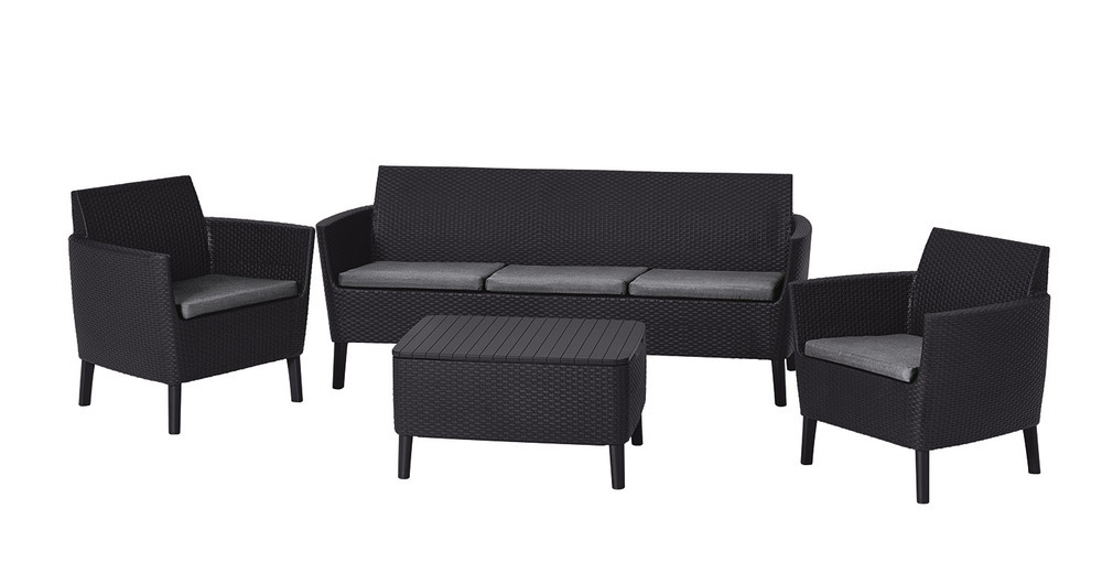 : KeterTrojmiestna súprava Salemo - súprava, ktorá sa bude skvele vynímať v modernom aj retro štýle bývania. Ide o elegantnú súpravu z imitácie ratanu, ktorá sa skladá z dvoch kresiel, trojitej pohovky a stolíka, ktorý slúži aj ako úložný box.