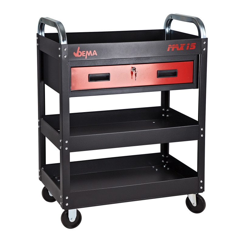 Trojposchodový servisný vozík vhodný na servisné práce, súčiastky, montáž, prepravu a do dielne. Vďaka veľkým kolesám sa ľahko a plynule presúva a je flexibilný. Extra stabilné štvorhranné držadlá na posúvanie sa dobre držia a sú pripevnené presne v tej správnej výške. Do uzamykateľnej zásuvky sa zmestí všetko, čo chcete chrániť pred prístupom iných. Celooceľová konštrukcia s povrchovou úpravou práškovaním. Dva otočné kolesá (každé s brzdou) a dva pevné kolesá. Vysoké okraje pre bezpečnú prepravu. Posuv zásuvky na guľôčkových ložiskách. Uzamykateľná zásuvka s výsuvom do 7/8 hĺbky. Dodáva sa v demonte.