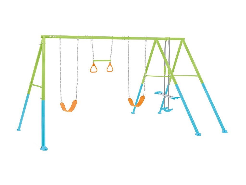 166.04 Multifunkčná hojdačka pre 2 deti, 4 rôzne funkcie - klasická hojdačka, trapéz s kruhmi a dve hojdačky s nastaviteľnou výškou. Kvalitný rám z pozinkovanej ocele, kotviaci systém na uchytenie do zeme.