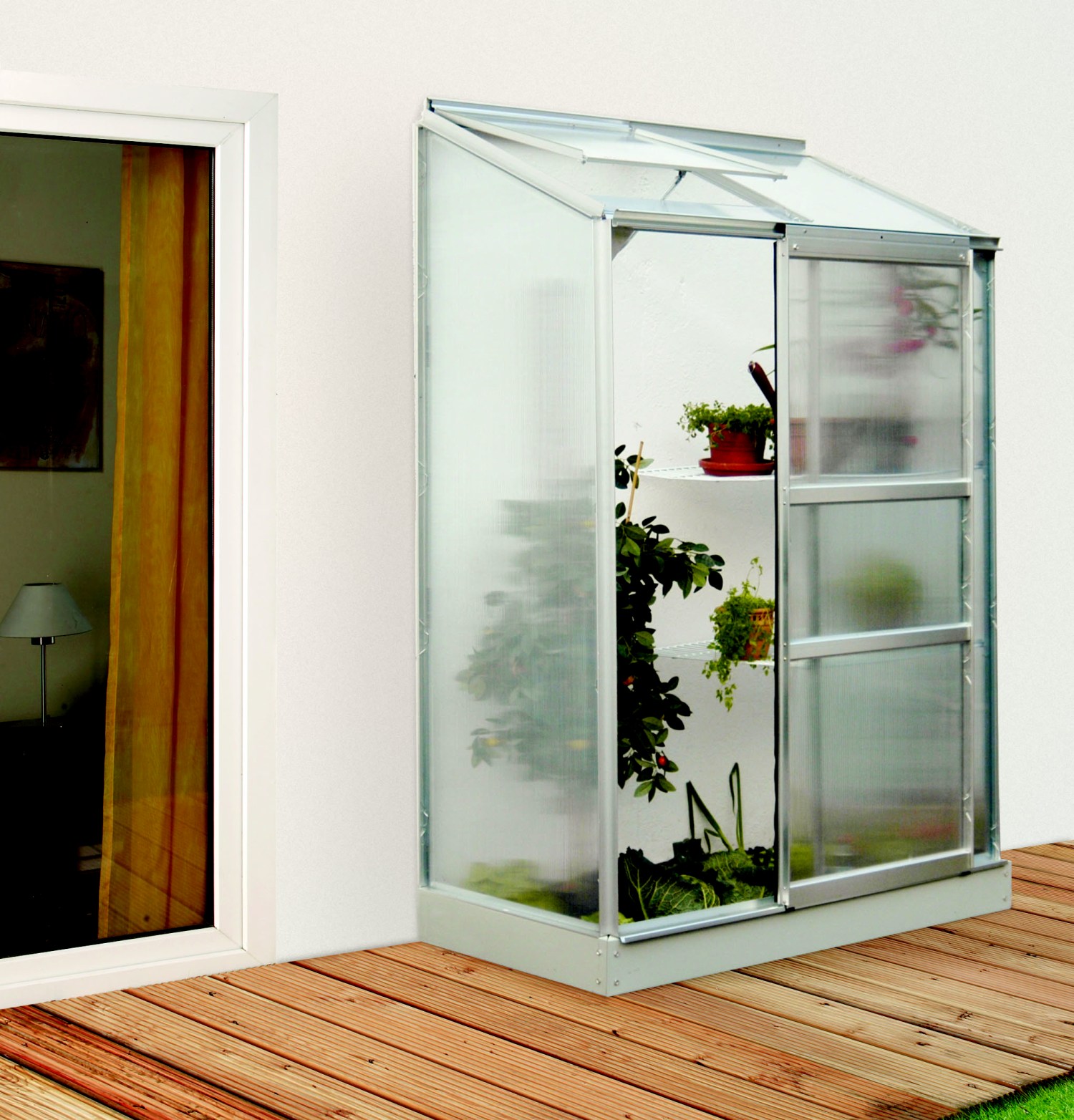 Skleníky k stene IDA sú zaradené do kategórie PREMIUM - skleník je vyrobený značkovým výrobcom z Veľkej Británie. Skleník je vyrobený z eloxovaných hliníkových profilov a dodávame ho s presklením z tepelno-izolačných dvojstenných komôrkových polykarbonátových dosiek 4 mm.