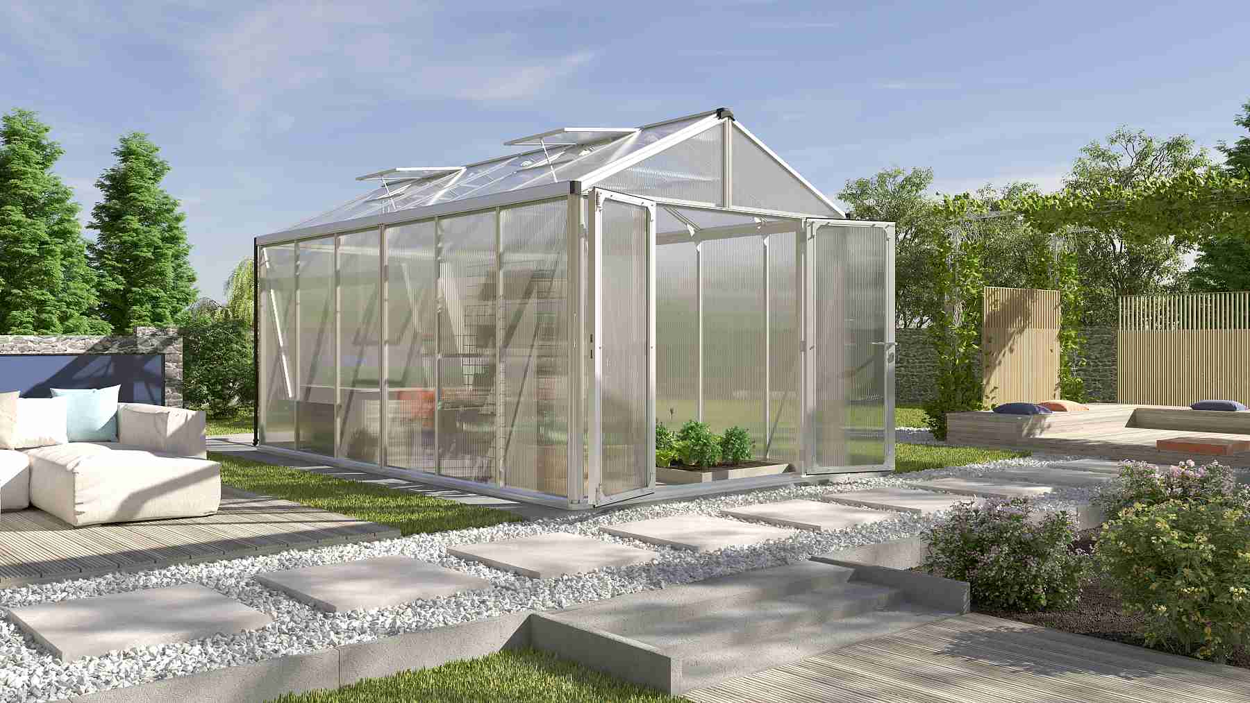 Skleníky ZEUS sú zaradené do kategórie PREMIUM - skleník je vyrobený značkovým výrobcom z Veľkej Británie. Presklenie je ukotvené do konštrukcie pomocou prítlačných hliníkových líšt (bočné steny) alebo je zasunuté do nosných profilov (strecha).