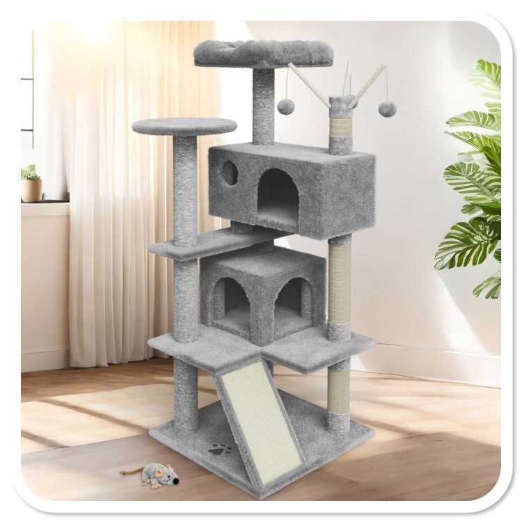 Škriabe vám Váš chlpatý maznáčik sedačku a šplhá po záclonách? S naším vymazleným škrabadlom už nebude! Doprajte svojej mačičke luxusné útočisko . Toto viacúrovňové škrabadlo je dokonalou kombináciou komfortu, bezpečia a zábavy , vďaka čomu splní všetky potreby vašej mačičky. Ponúka dva útulné domčeky , štyri vyvýšené plošiny, brmbolce na hranie a sisalové škrabacie stĺpiky. Moderný dizajn v šedom prevedení skvele doplní váš interiér.