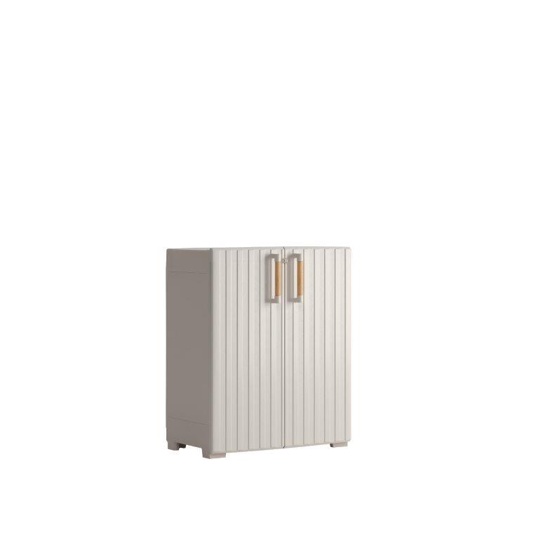 : KeterNízka plastová skriňa, uzamykateľná, nastaviteľné police s možnosťou sklopenia, nosnosť 30 kg, IPX3, drevené madlá.