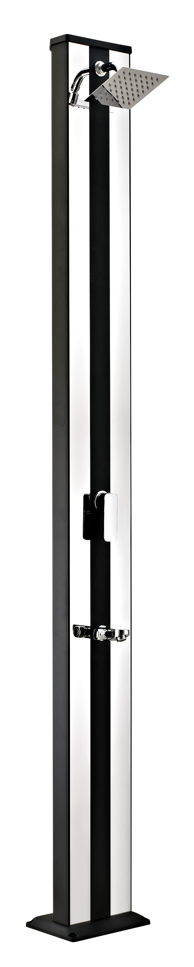 : CFLuxusná solárna sprcha, objem nádrže XXL 38 l, výška 218 cm, veľká sprchová hlavica 15 x 15 cm, nožný oplachovací kohútik, hmotnosť 15 kg. Vyrobená z hliníka a nehrdzavejúcej ocele, kovová páková batéria. Rýchlospojka na hadicu a montážne skrutky sú súčasťou dodávky.