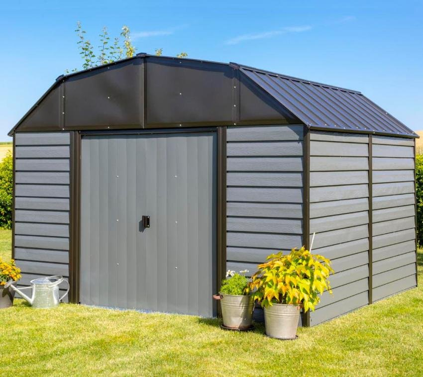 Spacemaker Woodhaven 109 kovový záhradný domček 273 x 313 x 223 cm, sivo - antracitová farba