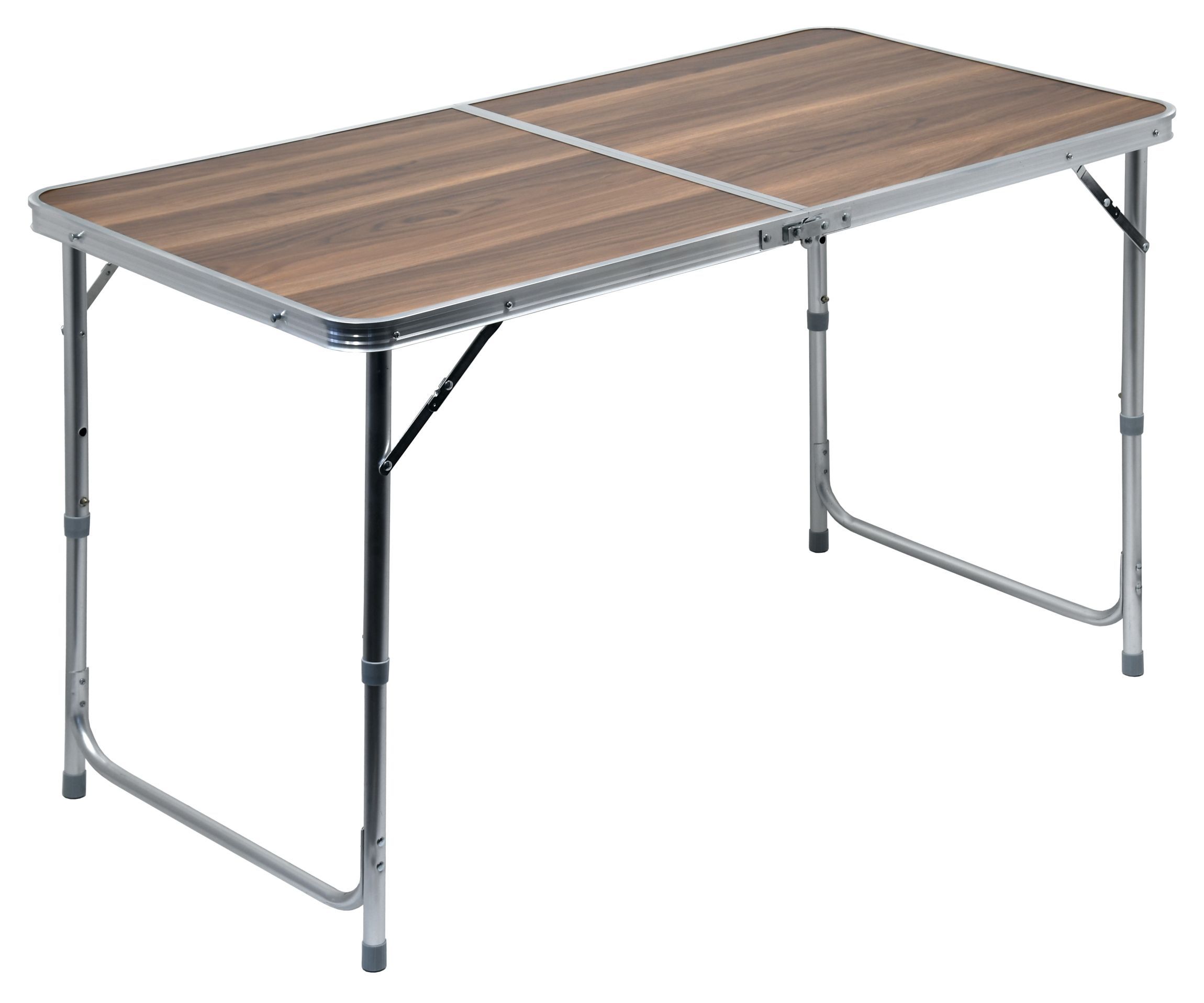 : CattaraĽahko umývateľný a skladný stôl Double z kvalitného hliníka a umakartu. Dekor umakartovej plochy so vzorom tmavého dreva. Teleskopické výškové nastavenie 56/ 62/ 72 cm.