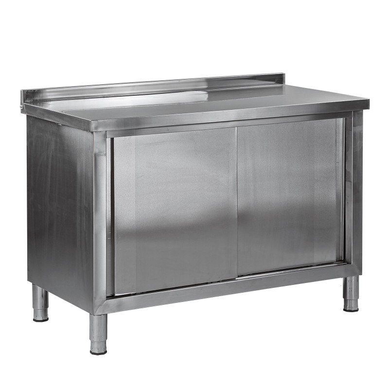 : DEMAStôl z nehrdzavejúcej ocele na skladovanie potravín a suché práce. Vďaka dvom posuvným dverám, výškovo nastaviteľným nožičkám a zadnému okraju ponúka optimálne pracovné podmienky. S dlhou životnosťou, veľká pracovná plocha (odoberateľná) so zadným okrajom.
