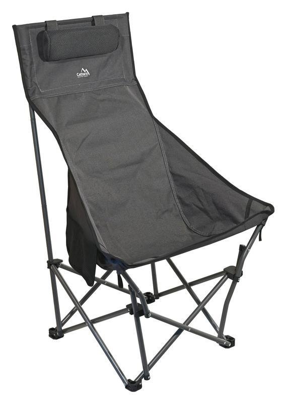: CattaraKempingová stolička so skladacou konštrukciou, dvojité sieťované vrecko na drobnosti, nosnosť až 100 kg, kvalitne zošitý poťah, oceľová konštrukcia.