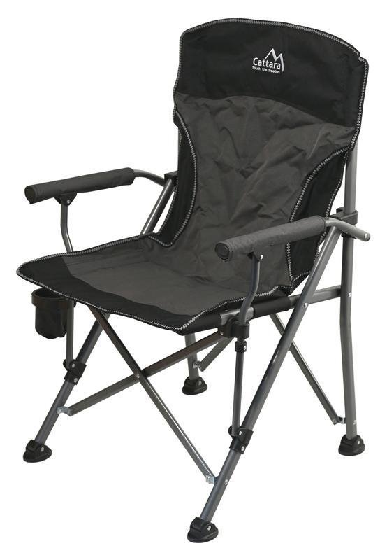 : CattaraKempingová stolička so skladacou konštrukciou, praktický držiak na nápoj, polstrované opierky na ruky, nosnosť až 135 kg, zošitý poťah, oceľová konštrukcia.