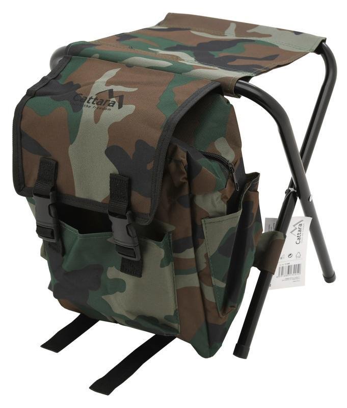 : CattaraKempingová stolička so skladacou konštrukciou, nosnosť až 90 kg. Kompaktné rozmery, nízka hmotnosť, ľahké zloženie a rozloženie. Praktický batoh s vreckami, nastaviteľnými popruhmi a hlavným priestorom s objemom 10 l. Čierna farba s khaki maskovaním.