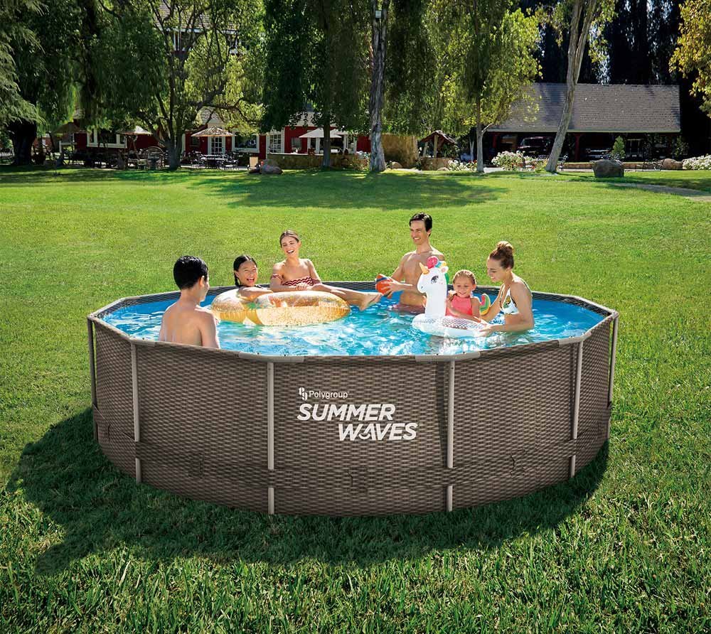 : Summer WavesPevný kovový rám nadzemného bazéna rýchlo postavíte na záhrade vďaka zacvakávaciemu systému. Filtračné čerpadlo SkimmerPlus 2 v 1 čistí vodu nonstop!