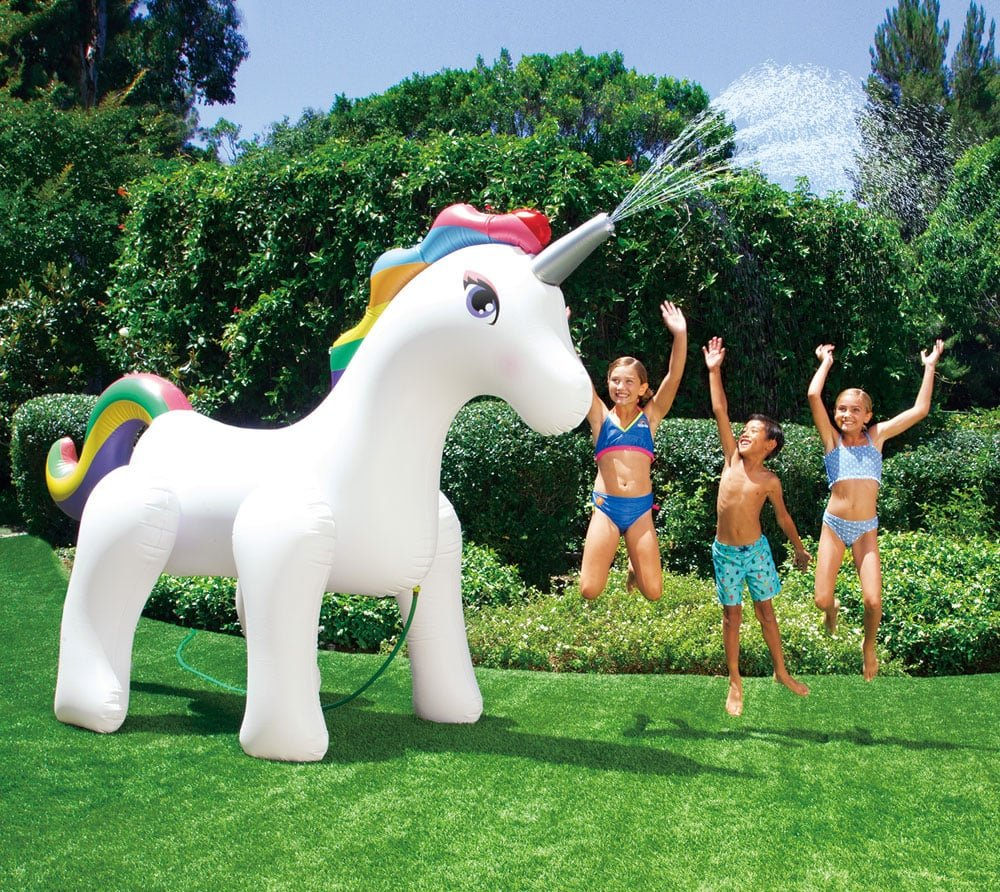 : Summer WavesNafukovací vodný postrekovač Summer Waves, detský záhradný vodný prvok, farebný jednorožec, 284x127x211 cm