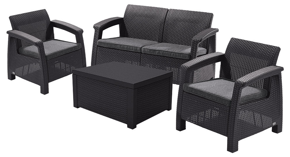 : KeterKorfu box je ďalšia súprava v obľúbenom dizajne Korfu. Je to elegantný kus nábytku v imitácii prírodného ratanu, ktorý sa skladá z dvoch kresiel, dvojpohovky a stolíka, ktorý slúži aj ako skrinka!