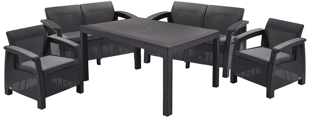 : KeterCorfu Fiesta je veľká súprava nábytku z imitácie prírodného ratanu, ktorá pozostáva z dvoch kresiel, dvoch dvojpohyblivých pohoviek a veľkého obdĺžnikového stola. Súprava je ideálna ako jedálenský set do vonkajších aj vnútorných priestorov.