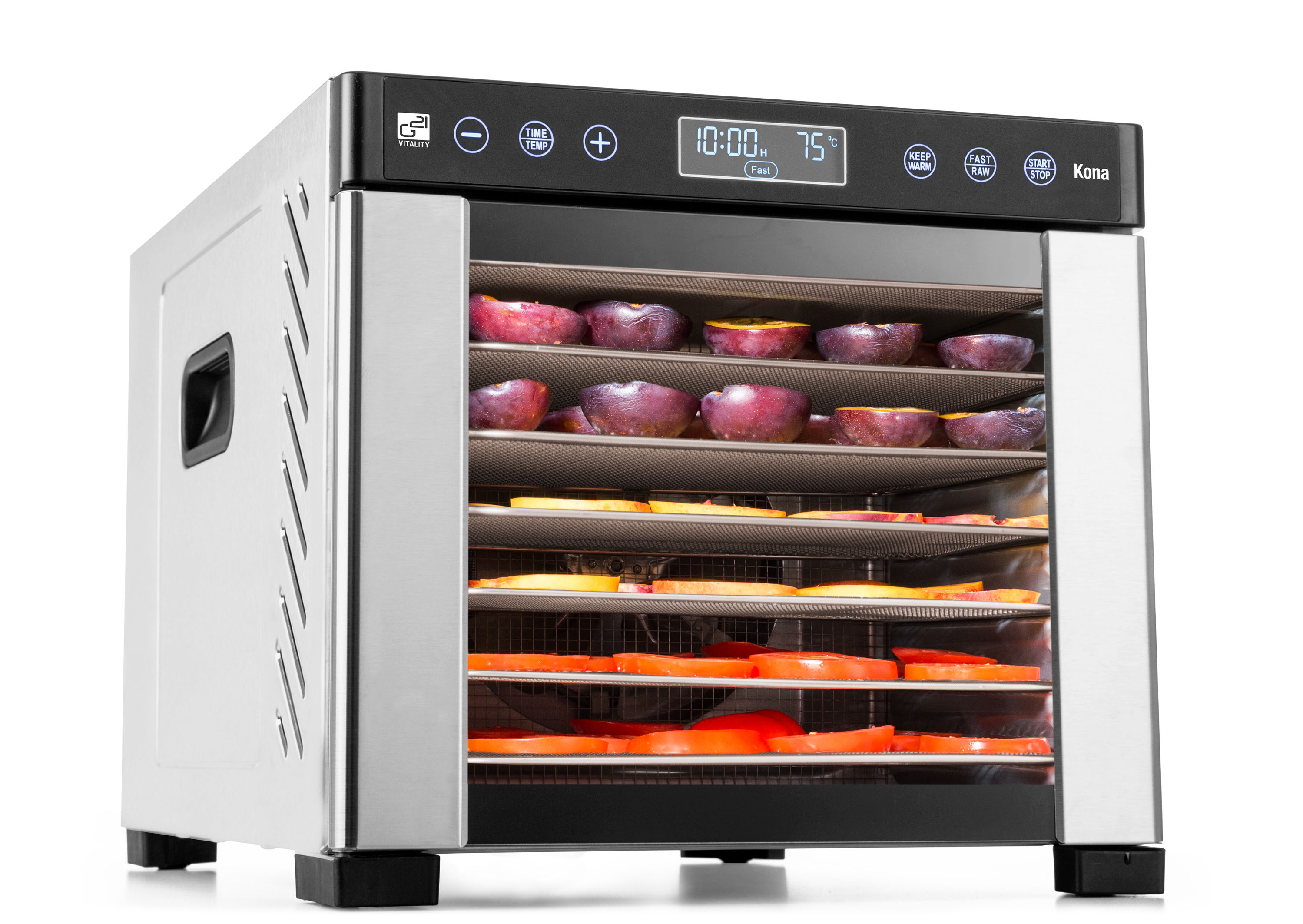 Špičková kompaktná sušička, horizontálne prúdenie vzduchu pre dokonale rovnomerné sušenie, 7 nerezových plátov, 7 jemných vložiek, časovač, termostat, automatické vypnutie, tichý chod.