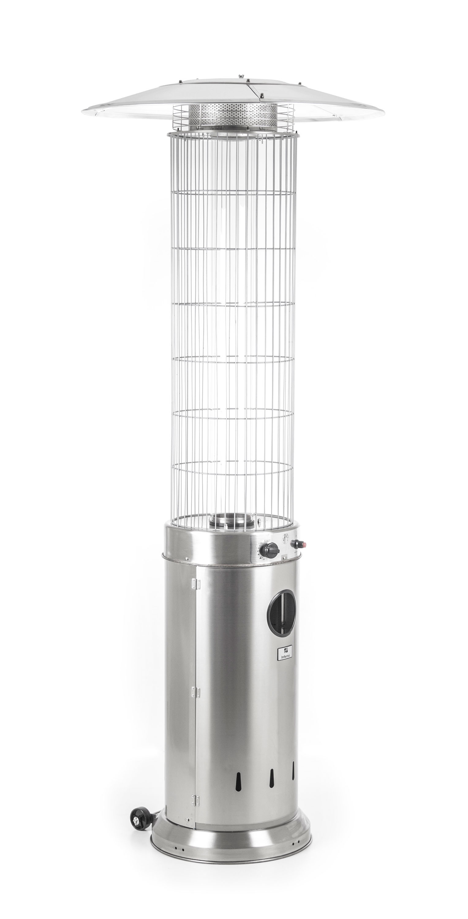 Vonkajší tepelný žiarič G21 Inferno v nerezovom vyhotovení s jednoduchým napojením na PB fľašu. Vysoký výkon – až 13 kW. Elegantné riešenie ohnivého plameňa v sklenenej trubici. Piezo elektrické zapaľovanie, kolieska pre ľahkú manipuláciu.