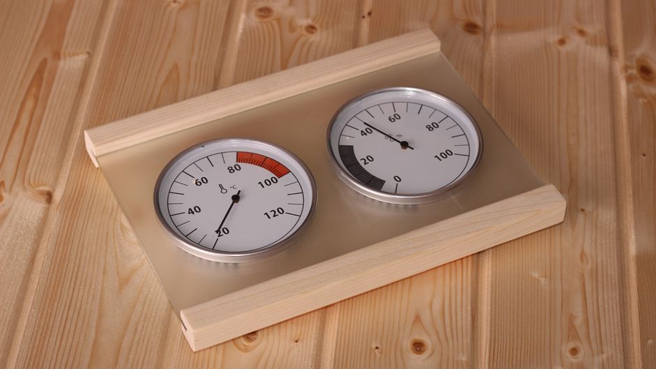 Prémiová stanica na meranie klímy vám ukazuje teplotu a vlhkosť. Tieto parametre môžete sledovať a upravovať si klímu v saune podľa seba. Meracie prístroje majú priemer 10 cm a každý je uzavretý v kovovom puzdre. Počas saunovania sa tak môžete zorientovať. Matné bezpečnostné sklo s dreveným rámom obopína obe zariadenia a zaisťuje zvláštny vzhľad. Rozmery stanice (š x v) 24,5 x 18 cm. Využite výhody a skrášlite svoju saunu pomocou prémiovej stanice na meranie klímy.