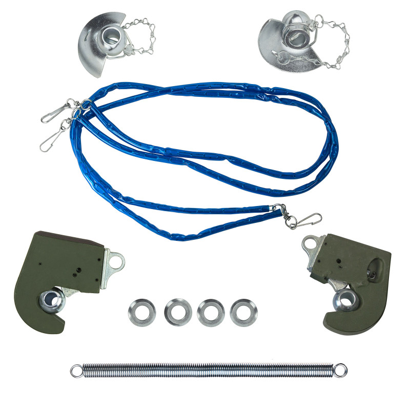 Súprava na montáž rýchlospojky pre bezpečné, rýchle a profesionálne spojenie prípojných zariadení kategórie II s traktorom. Súprava na montáž rýchlospojky pre bezpečné, rýchle a profesionálne spojenie prípojných zariadení zariadení kategórie II s traktorom. Súprava sa skladá z dvoch oceľových záchytných hákov na spodné rameno, na privarenie; jednej hnacej reťaze s karabínovým hákom, obalená plastom; jednej stabilizačnej pružiny z kovu, galvanicky pozinkovaná; dvoch záchytných gulí s celokovovým golierom, galvanicky pozinkované; dvoch celokovových gulí spodného ramena hydraulického riadenia, galvanicky pozinkované; štyroch celokovových dištančných vyrovnávacích krúžkov, galvanicky pozinkované.
