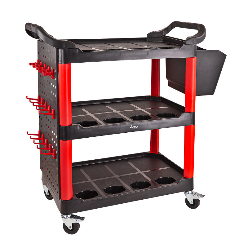 : DEMAMimoriadne praktický, univerzálny vozík do dielne, lakovne, garáže, domácnosti a na dvor. Tri poschodia majú optimálnu veľkosť aj výšku, a tak máte všetko dokonale zorganizované a poruke priamo na pracovisku, či už náradie, mazivá, spreje, laky, handričky a drobné nástroje.