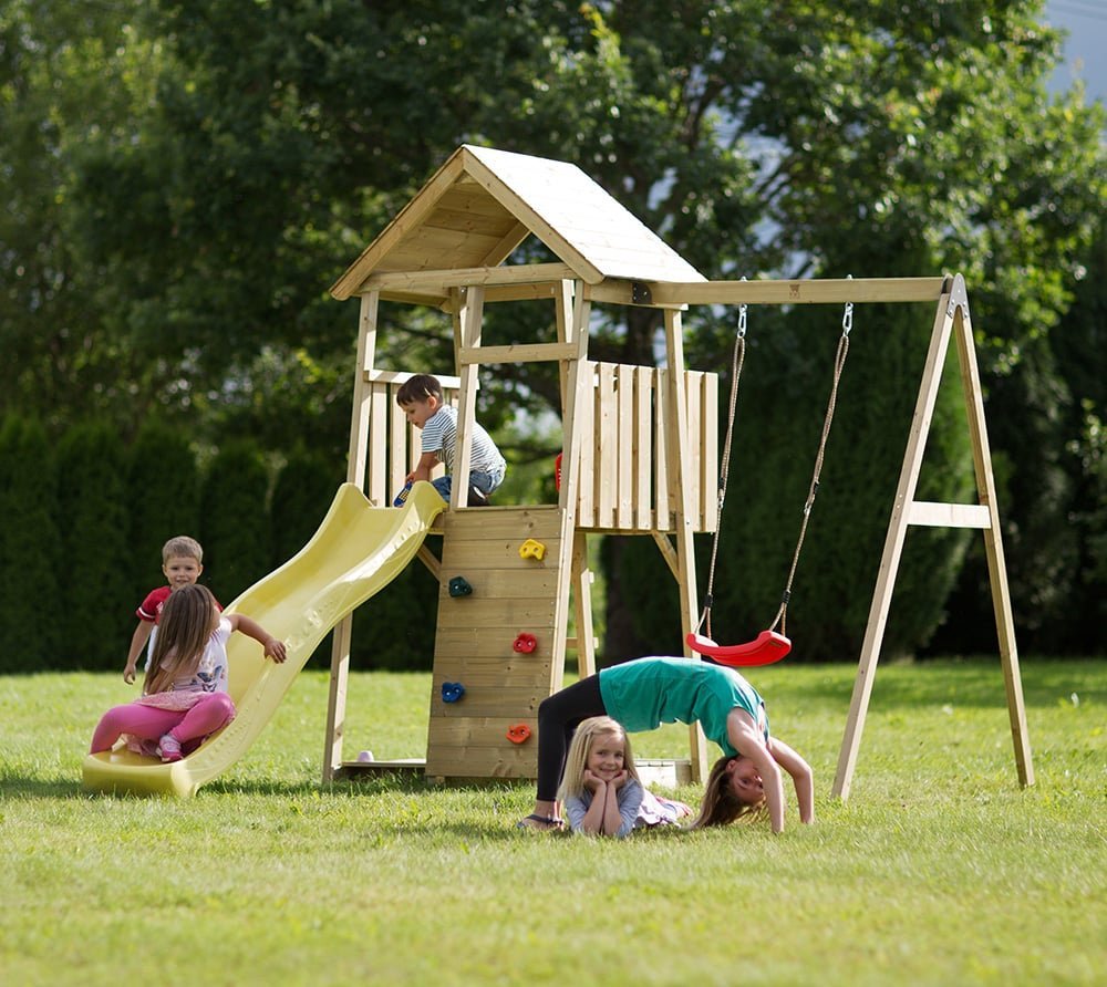 : Wendi toysIhrisko Včielka od Wendi Toys je vyrobená z udržateľného dreva a ponúka množstvo zábavy pre malých dobrodruhov so šmýkačkou, mini lezeckou stenou, hojdačkou a pieskoviskom.