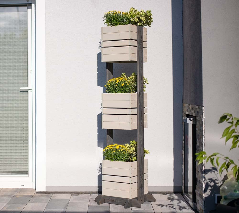 Vertikálny kvetináč Maja od Westmann uľahčuje vytváranie dekoratívnej zelene na malých plochách vďaka trom kvetináčom umiestneným nad sebou.