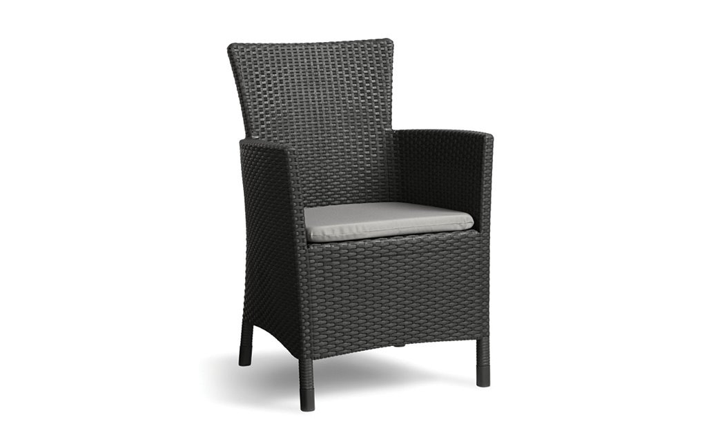 : KeterNízkoúdržbové záhradné kreslo, maximálna nosnosť až 110 kg, vysoká odolnosť voči rôznorodým vplyvom, mäkká poduška a ergonomicky tvarované chrbtové operadlo pre vyšší komfort. PP živica, molitan, bavlna a polyester. Vysoko stála grafitová farba.