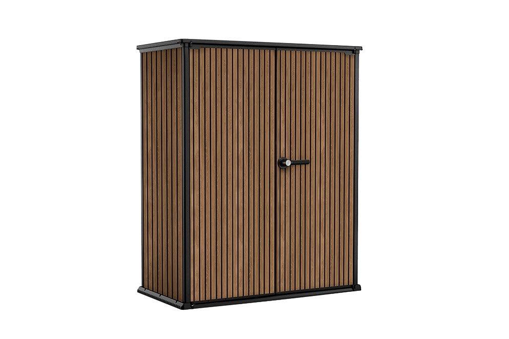 Záhradný box, technológia DecoCoat – odolnosť voči nepriaznivým poveternostným vplyvom, hrdzi a hnilobe, ľahká údržba, dvojité dvere, 2 police, štruktúra pripomínajúca skutočné drevo.